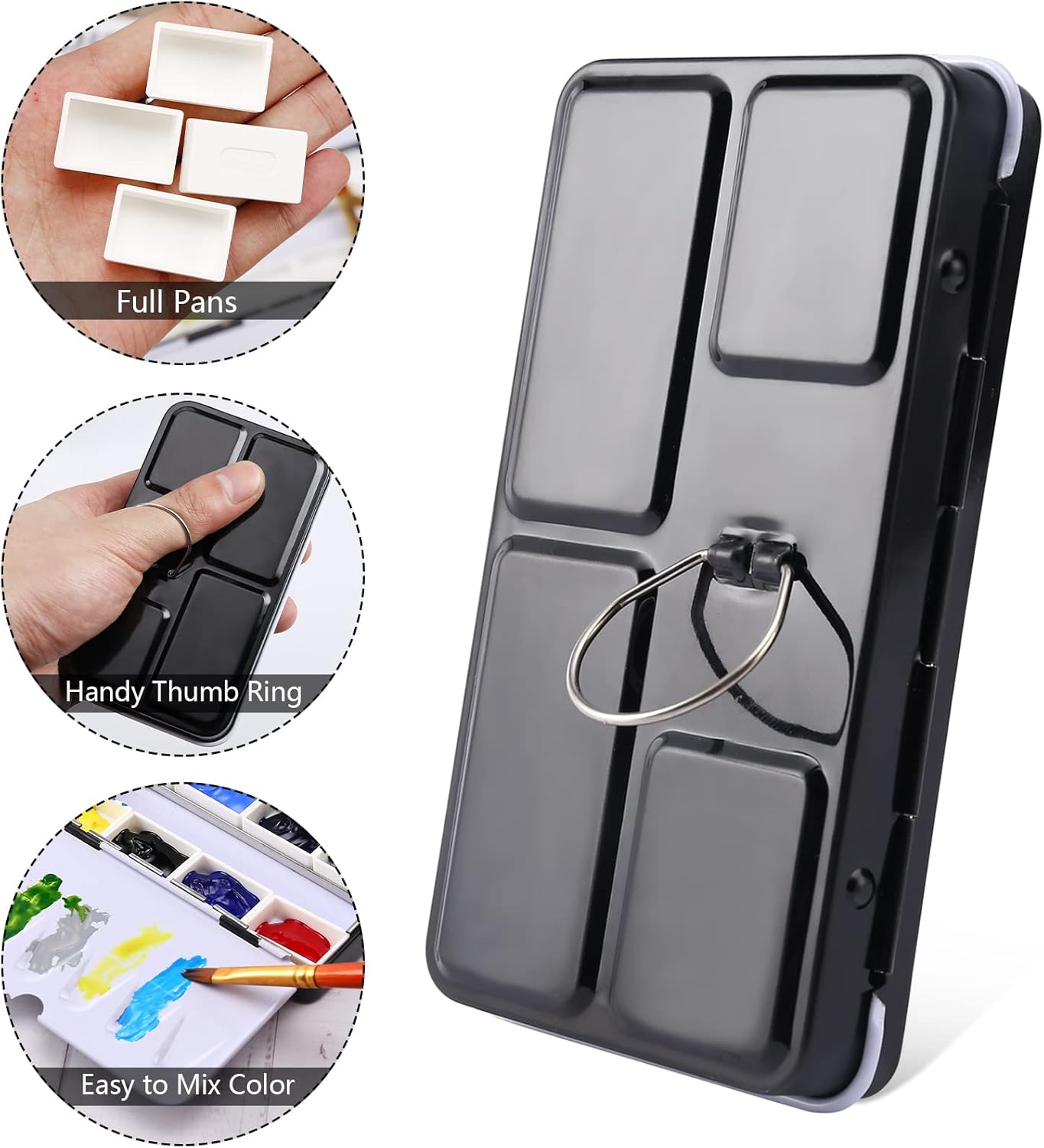 🎨 Paint Area: Includes 12 removable half pans (small plastic paint wells) for solid watercolor, tube colors, or refillable handmade paints. Pans can be freely arranged or replaced.