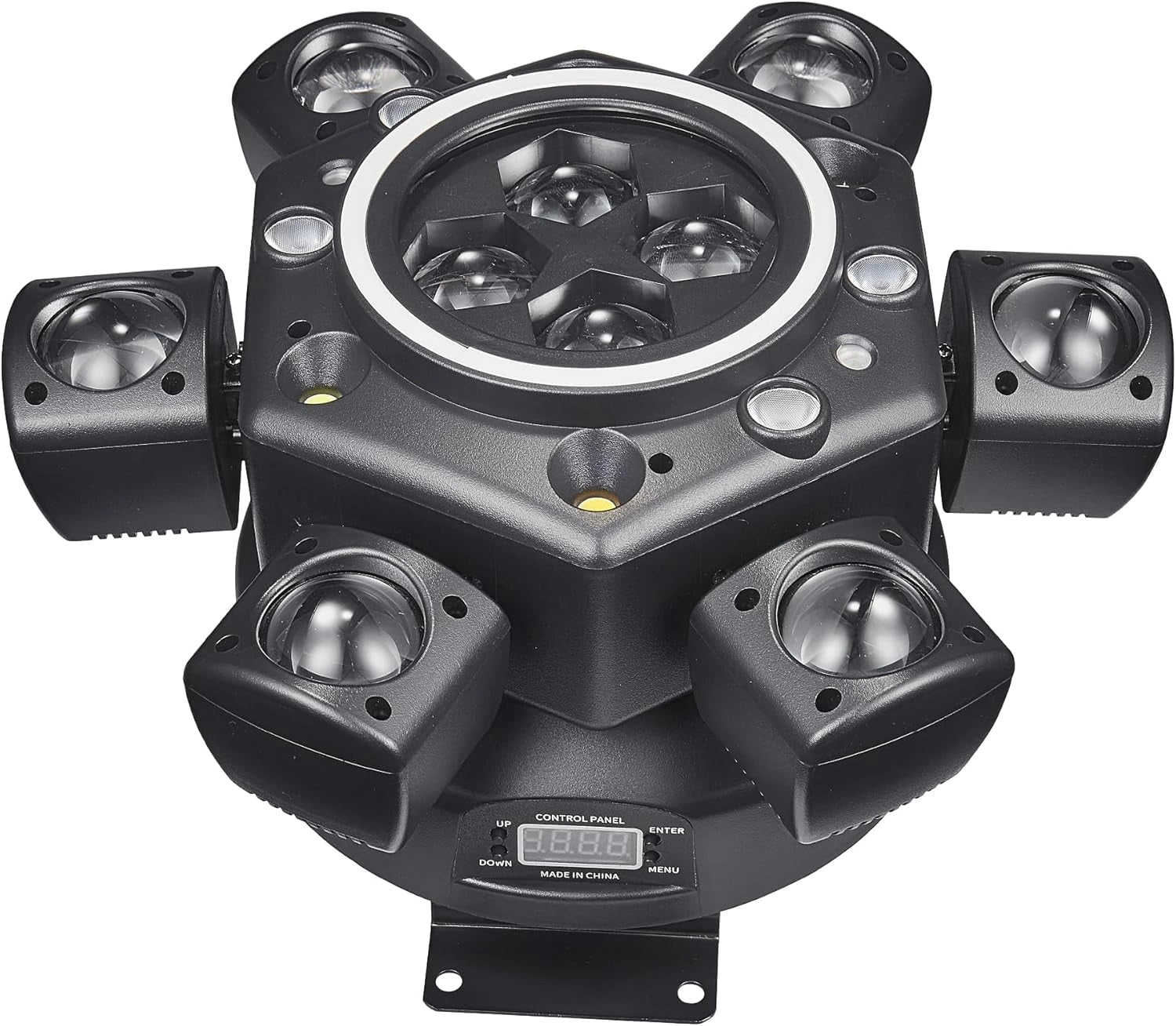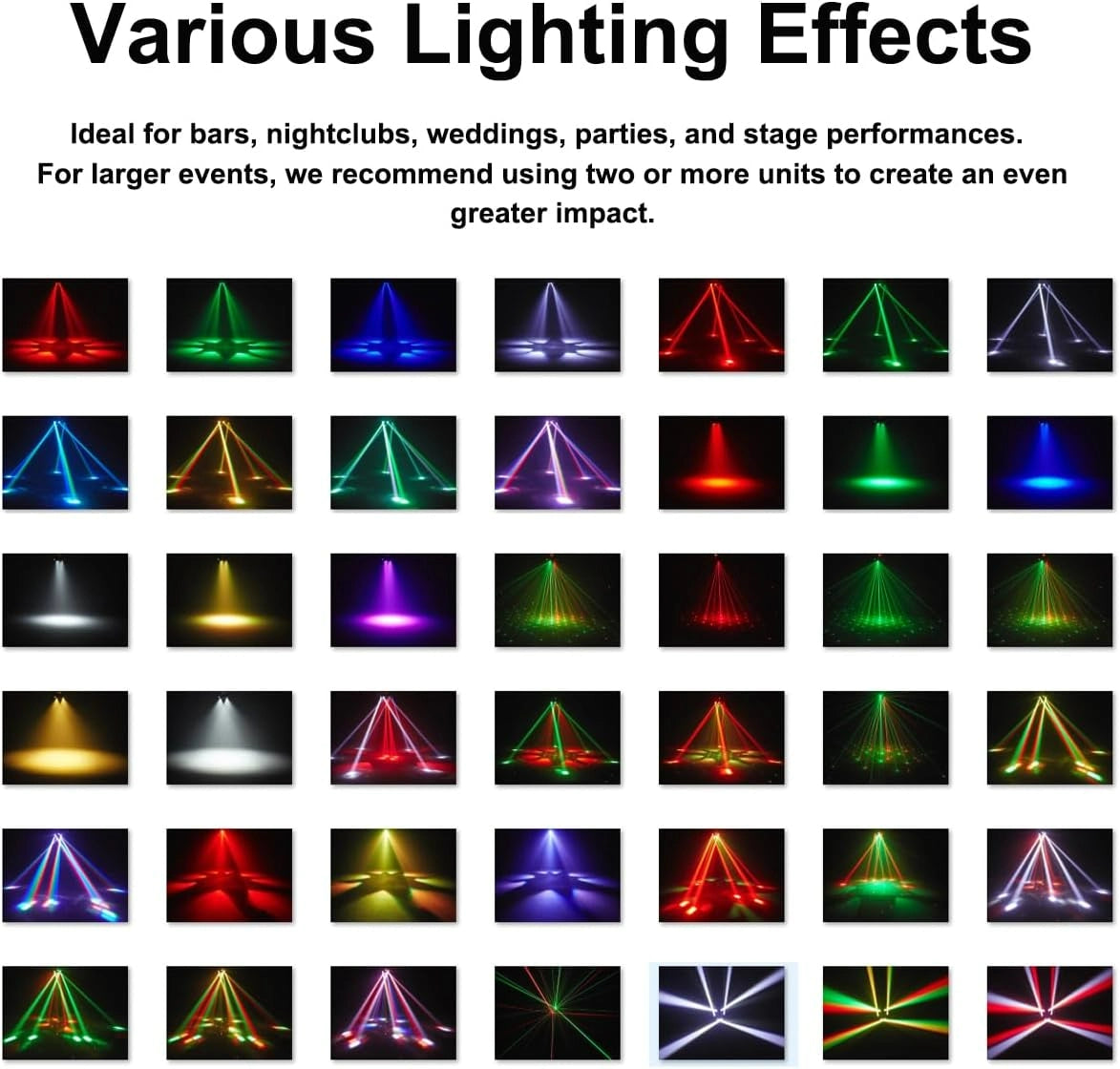 - ćBrilliant 6-Arm RGBW BeamćFeaturing 6 arms with 6*10W 6-in-1 RGBW LEDs, each arm offers a 15° beam angle and 180° rotation effect. Additionally, it includes 4 PCS CREE 10W RGBW ball, 4PCS 3535 8W RGBW ball,1 PCS 50mW red starry light ,1PCS green starry lightļ¼2PCS 10W white LED,2PCS 10W yellow LEDļ¼22PCS 5050 0.2WLED. These vibrant and colorful beams create an electrifying atmosphere that energizes any event.
